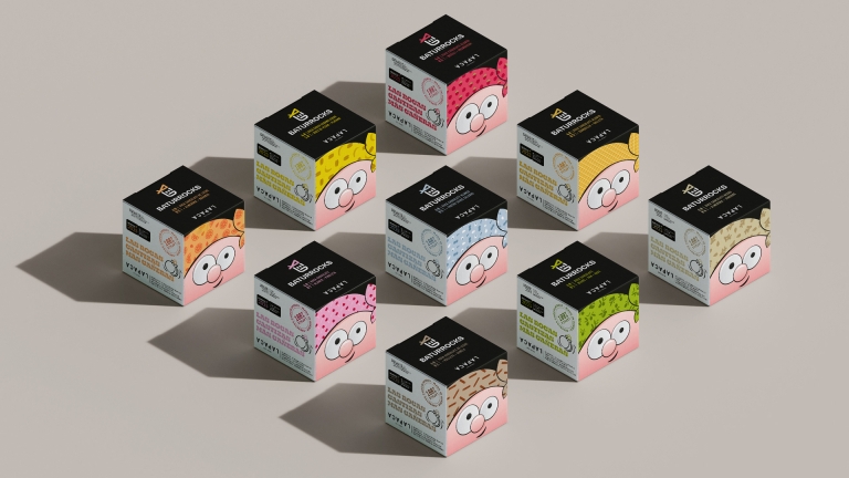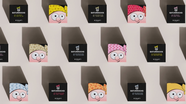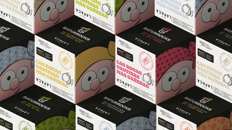 Among its exclusive creations are Baturrocks, irresistible chocolate clusters with nuts that pay tribute to Aragonese culture. Their innovative packaging turns the baturro into a visual icon, with each flavor distinguished by a colored cachirulo and a stackable box design that invites customers to mix, match, and collect. A unique concept that transforms chocolate into an experience.